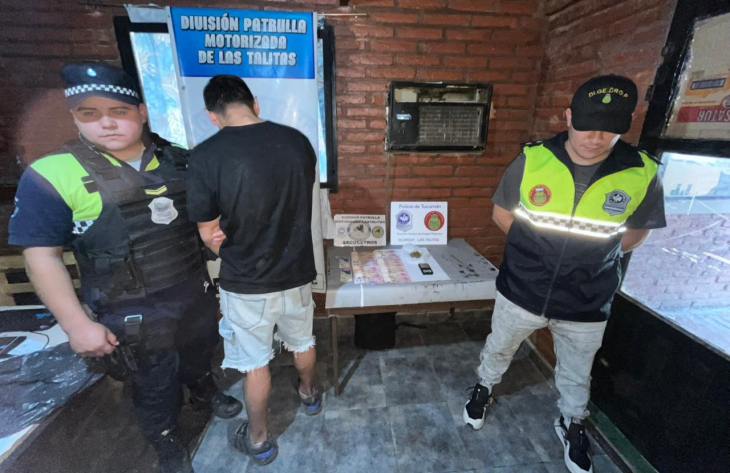En un trabajo conjunto entre personal de la División Patrulla Motorizada Las Talitas y de Patrulleros, llevaron adelante un procedimiento en la siesta de este miércoles luego de sorprender a un hombre en el pasaje Wilton de La Rosa y Gobernador Gutiérrez con las drogas y los elementos que permiten su comercialización al menudeo.